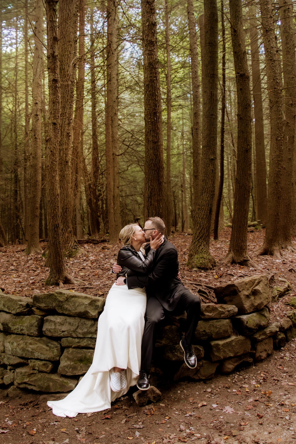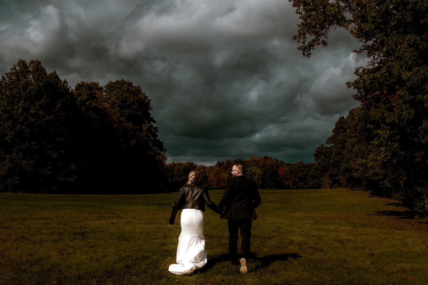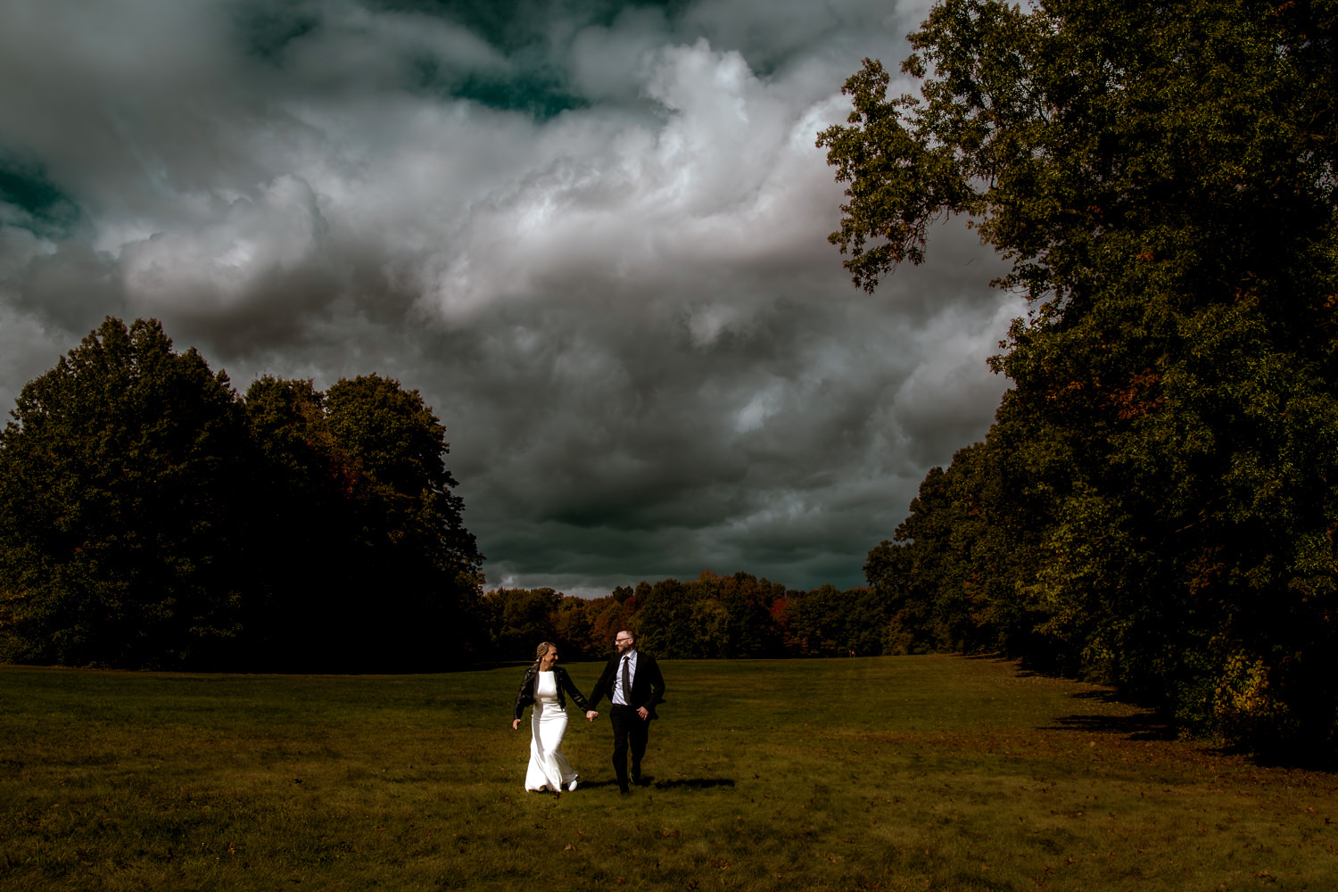 After a short and sweet ceremony with close friends and family, we headed through a magical and colorful fall forest for couples portraits. A pop-up rain storm caused us to pause and so we found some temporary shelter. After the rain stopped, we headed back out, only to discover the most incredibly dramatic sky.